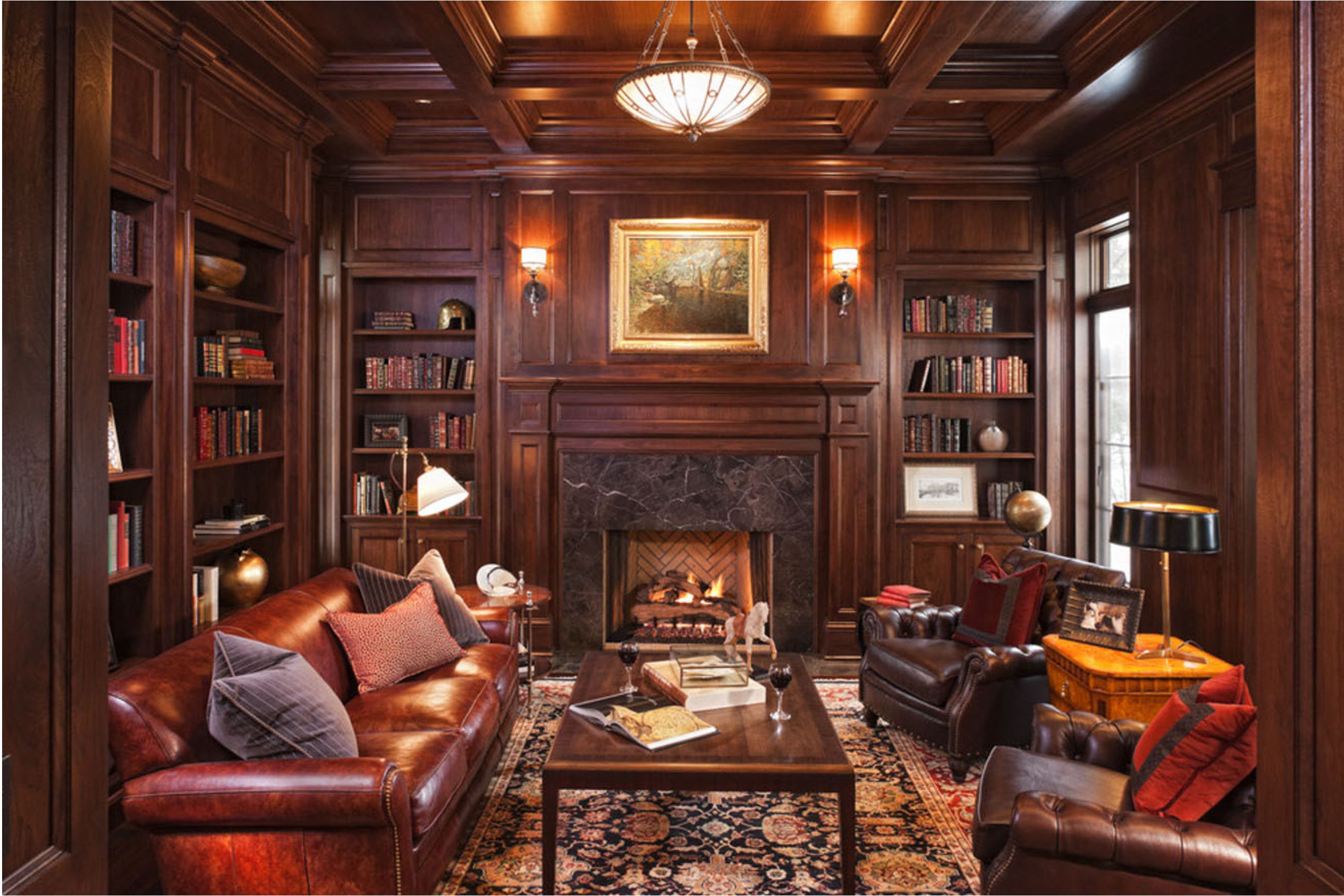 Il progetto realizzato da Fabbrika Arredamenti Italia, ha avvolto questo soggiorno con una classica boiserie in cui spicca il camino.